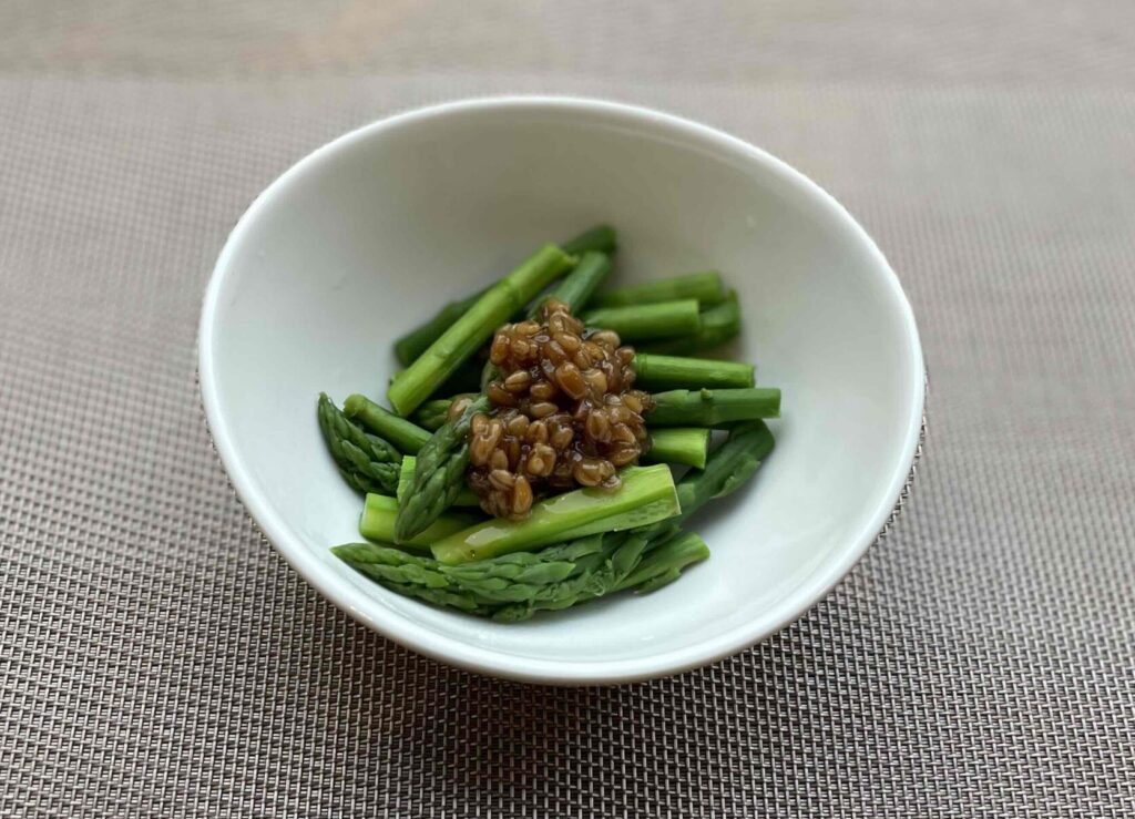 小さめのボウルに、ひしおを入れ、グリーンアスパラガスを加えてあえる。